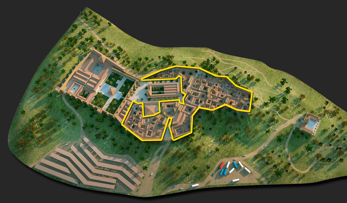 The medina of Ciudad Al-ManSur has its main streets that start from the welcome space and city gates, within which we find the open-air market, the Alcazar, the Alcaicería, the Public Baths and endless secondary streets and alleyways full of life.