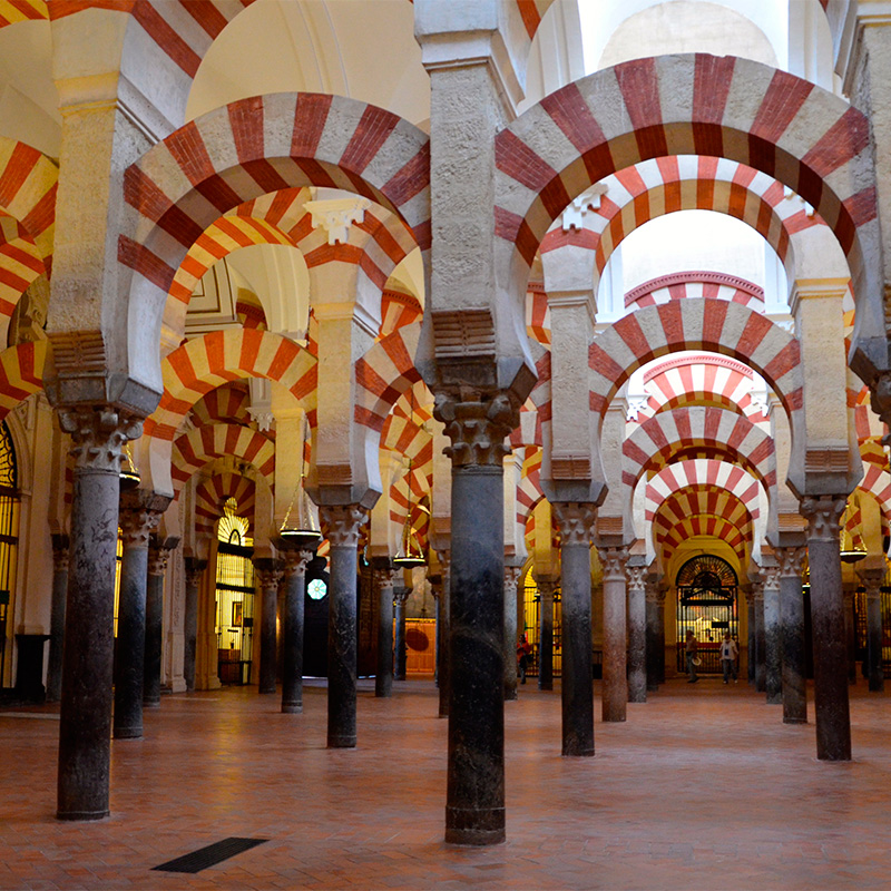 The Great Mosque of Cordoba was the first to be built in Andalusi territory. It is impressive with its almost five hundred columns and superimposed arches, fruit of the works of Abd al-Rahman I, Abd al-Rahman II and al-Hakam II, and finally in 987, Abu Amir al-Mansur (Latin and Spanish, Almanzor) himself. The Cordoba Mosque is not only a symbol of Al-Andalus, but also a fundamental monument of the entire Islamic West and one of the most amazing ones in the world.